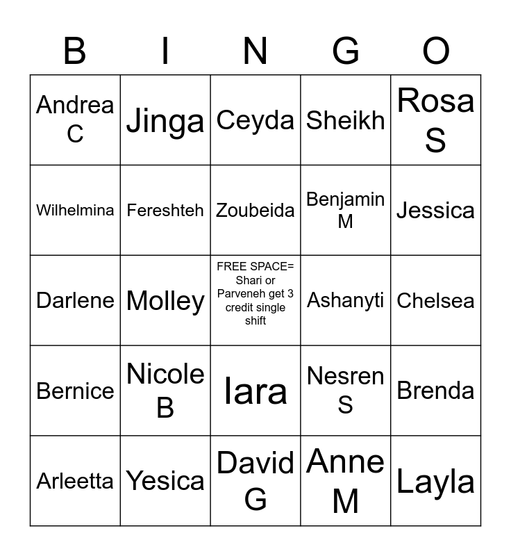 This bingo card has a free space and 24 words: Nicole B, Yesica, Zoubeida, Arleetta, Rosa S, Andrea C, Wilhelmina, Jinga, Ashanyti, Iara, Benjamin M, Darlene, Nesren S, Brenda, Fereshteh, Anne M, Chelsea, Ceyda, Jessica, Molley, Layla, Bernice, Sheikh and David G.