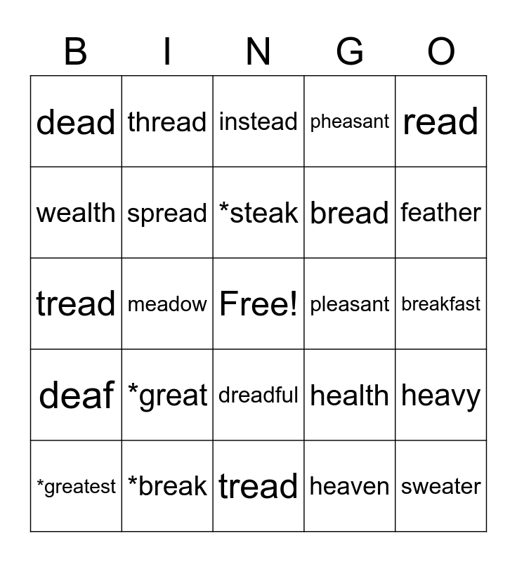 This bingo card has a free space and 24 words: *great, *break, *steak, *greatest, read, dead, wealth, thread, pleasant, dreadful, bread, tread, health, heavy, spread, heaven, breakfast, instead, feather, meadow, sweater, deaf, pheasant and tread.