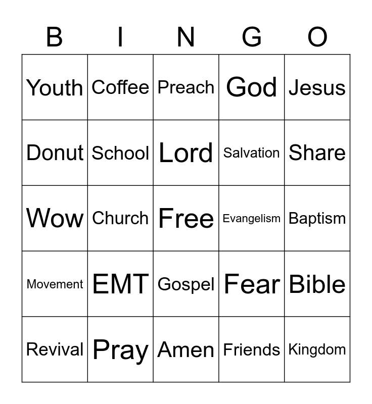 This bingo card has a free space and 24 words: EMT, Pray, Lord, Revival, Jesus, Youth, Donut, Coffee, Evangelism, Gospel, Salvation, Wow, Fear, Bible, School, Friends, Baptism, Preach, Share, Church, Kingdom, Movement, God and Amen.