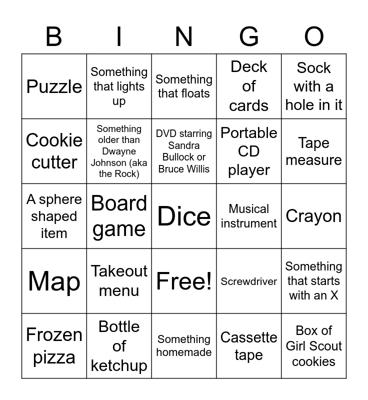 This bingo card has 26 words: Free!, Cassette tape, DVD starring Sandra Bullock or Bruce Willis, Bottle of ketchup, Sock with a hole in it, Puzzle, Cookie cutter, Something that lights up, Crayon, Screwdriver, Portable CD player, A sphere shaped item, Something that starts with an X, Frozen pizza, Board game, Sewing Kit, Deck of cards, Map, Something that floats, Dice, Tape measure, Something homemade, Musical instrument, Takeout menu, Something older than Dwayne Johnson (aka the Rock) and Box of Girl Scout cookies.