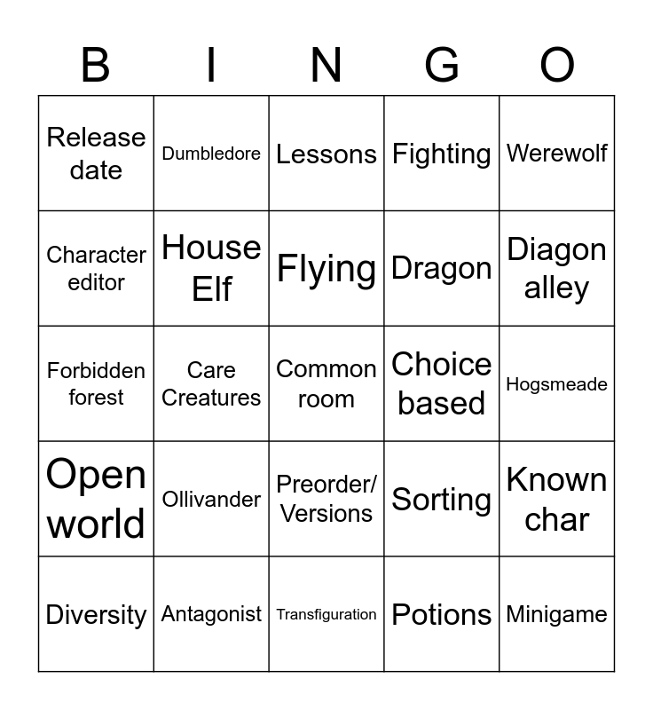 This bingo card has a free space and 24 words: Ollivander, Antagonist, Flying, Diversity, Werewolf, Release date, Character editor, Dumbledore, Choice based, Preorder/ Versions, Dragon, Forbidden forest, Sorting, Known char, House Elf, Potions, Hogsmeade, Lessons, Diagon alley, Care Creatures, Minigame, Open world, Fighting and Transfiguration.