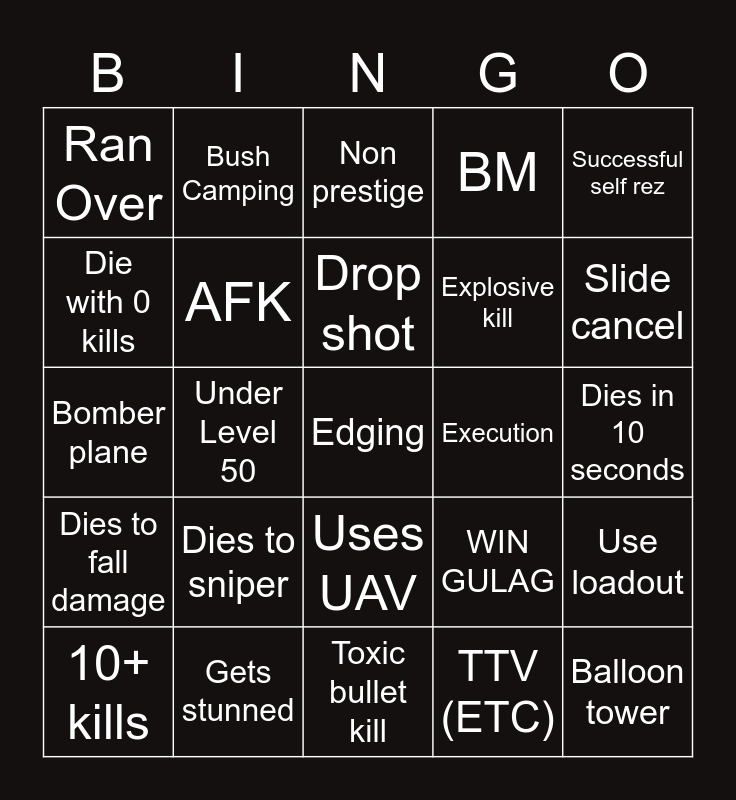 This bingo card has 25 words: Dies to sniper, Toxic bullet kill, Drop shot, 10+ kills, Successful self rez, Ran Over, Die with 0 kills, Bush Camping, Execution, Uses UAV, Explosive kill, Bomber plane, WIN GULAG, Use loadout, AFK, Balloon tower, Dies in 10 seconds, Non prestige, Slide cancel, Under Level 50, Edging, Gets stunned, Dies to fall damage, BM and TTV (ETC).