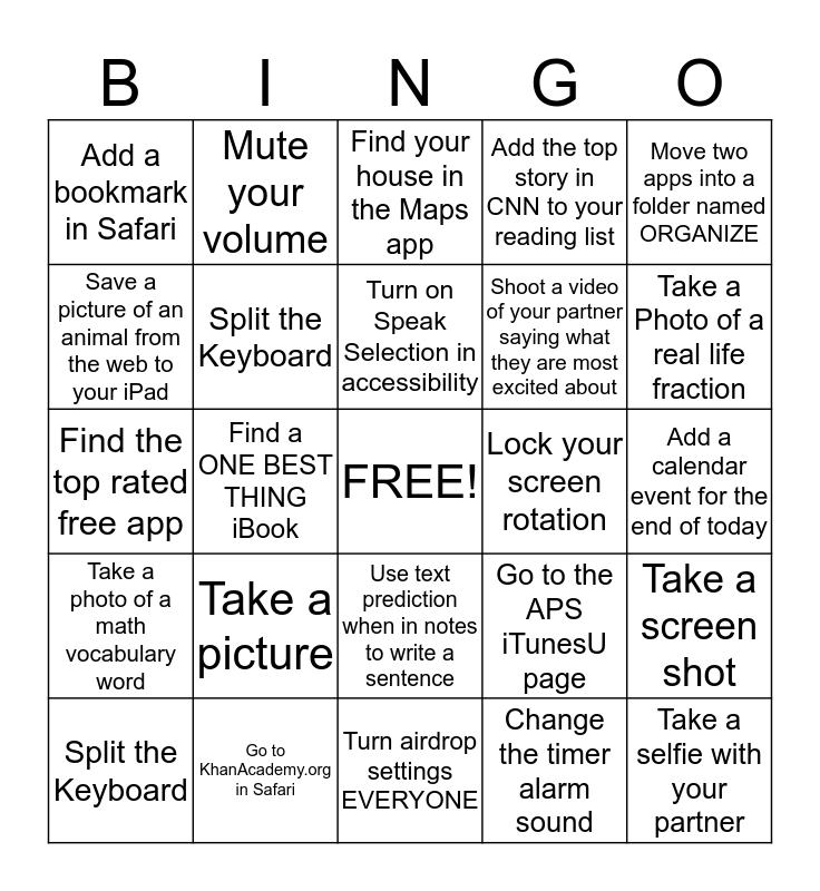 This bingo card has a free space and 24 words: Take a picture, Go to KhanAcademy.org in Safari, Turn on Speak Selection in accessibility, Split the Keyboard, Move two apps into a folder named ORGANIZE, Add a bookmark in Safari, Save a picture of an animal from the web to your iPad, Mute your volume, Lock your screen rotation, Use text prediction when in notes to write a sentence, Shoot a video of your partner saying what they are most excited about, Find the top rated free app, Go to the APS iTunesU page, Take a screen shot, Split the Keyboard, Change the timer alarm sound, Add a calendar event for the end of today, Find your house in the Maps app, Take a Photo of a real life fraction, Find a ONE BEST THING iBook, Take a selfie with your partner, Take a photo of a math vocabulary word, Add the top story in CNN to your reading list and Turn airdrop settings EVERYONE.