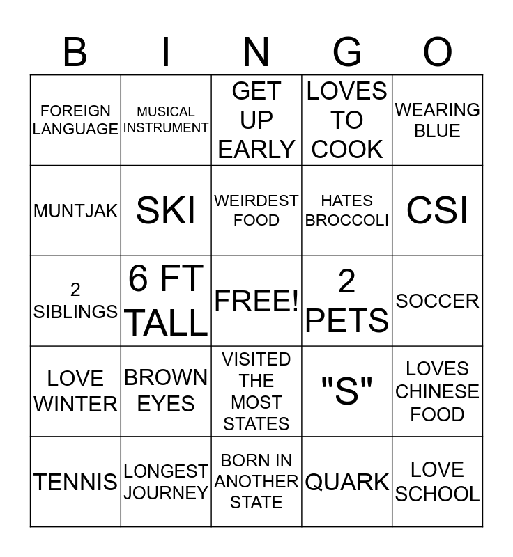 This bingo card has a free space and 24 words: BROWN EYES, LONGEST JOURNEY, WEIRDEST FOOD, TENNIS, WEARING BLUE, FOREIGN LANGUAGE, MUNTJAK, MUSICAL INSTRUMENT, 2 PETS, VISITED THE MOST STATES, HATES BROCCOLI, 2 SIBLINGS, "S", LOVES CHINESE FOOD, SKI, QUARK, SOCCER, GET UP EARLY, CSI, 6 FT TALL, LOVE SCHOOL, LOVE WINTER, LOVES TO COOK and BORN IN ANOTHER STATE.