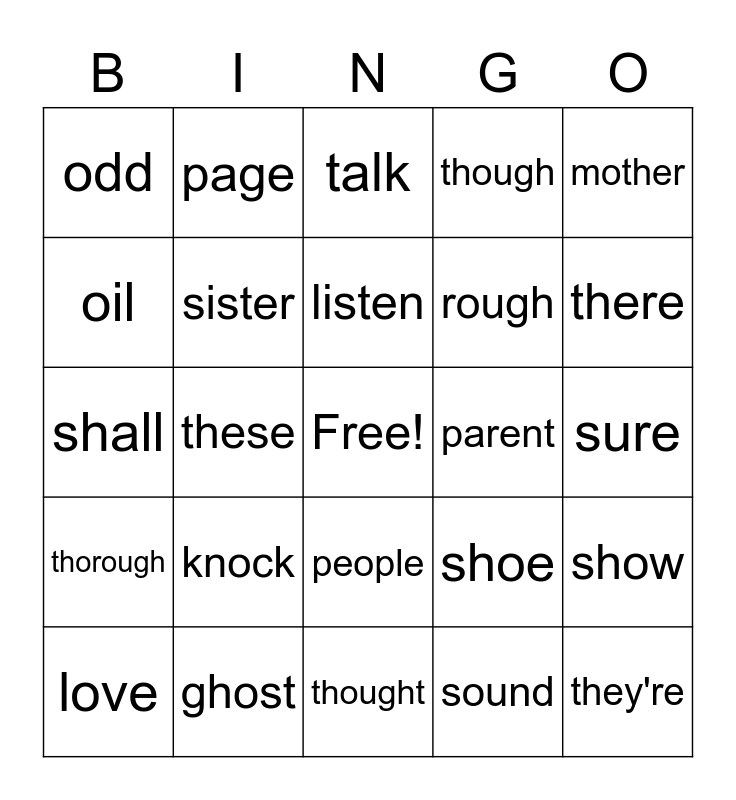 This bingo card has a free space and 24 words: knock, ghost, listen, love, mother, odd, oil, page, parent, people, rough, shall, shoe, show, sister, sound, sure, talk, there, these, they're, thorough, though and thought.