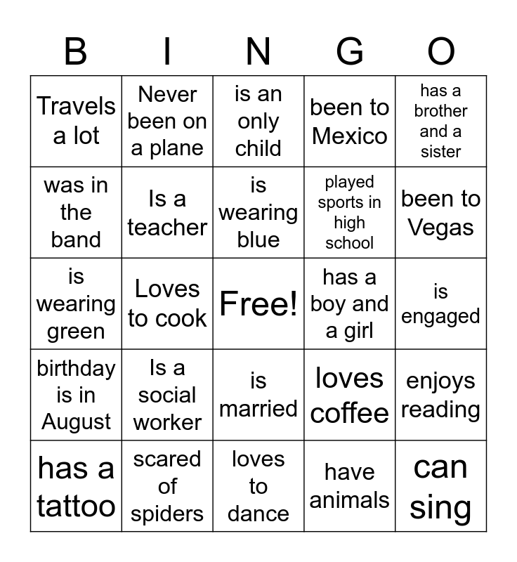 This bingo card has a free space and 29 words: has a tattoo, Birthday is in January, Loves to cook, likes to eat, Travels a lot, is an only child, Is a teacher, Is a social worker, has a boy and a girl, scared of spiders, is engaged, can sing, loves to dance, have animals, been to Vegas, afraid of heights, is married, birthday is in August, has a brother and a sister, is wearing green, loves coffee, can play an instrument, played sports in high school, was in the band, been to Mexico, Never been on a plane, enjoys reading, is wearing blue and is the oldest child.