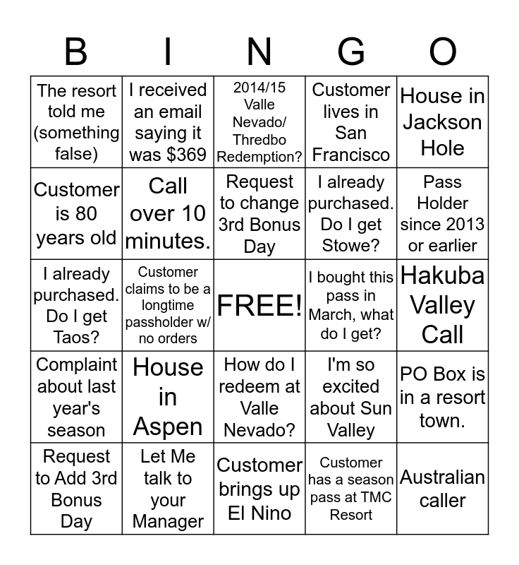 This bingo card has a free space and 24 words: House in Aspen, Let Me talk to your Manager, Request to change 3rd Bonus Day, Request to Add 3rd Bonus Day, House in Jackson Hole, The resort told me (something false), Customer is 80 years old, I received an email saying it was $369, I bought this pass in March, what do I get?, How do I redeem at Valle Nevado?, I already purchased. Do I get Stowe?, I already purchased. Do I get Taos?, I'm so excited about Sun Valley, PO Box is in a resort town., Call over 10 minutes., Customer has a season pass at TMC Resort, Hakuba Valley Call, 2014/15 Valle Nevado/ Thredbo Redemption?, Pass Holder since 2013 or earlier, Customer claims to be a longtime passholder w/ no orders, Australian caller, Complaint about last year's season, Customer lives in San Francisco and Customer brings up El Nino.