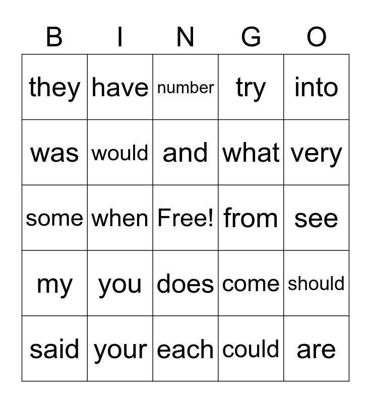 This bingo card has a free space and 24 words: you, your, and, said, into, they, was, have, from, does, what, some, come, should, would, could, see, number, very, when, are, my, try and each.