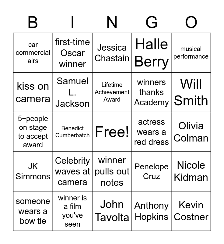 This bingo card has a free space and 24 words: Celebrity waves at camera, winner is a film you've seen, Lifetime Achievement Award, someone wears a bow tie, musical performance, car commercial airs, kiss on camera, first-time Oscar winner, actress wears a red dress, winner pulls out notes, winners thanks Academy, 5+people on stage to accept award, Penelope Cruz, Nicole Kidman, Samuel L. Jackson, Anthony Hopkins, Olivia Colman, Jessica Chastain, Will Smith, Benedict Cumberbatch, Kevin Costner, JK Simmons, Halle Berry and John Tavolta.