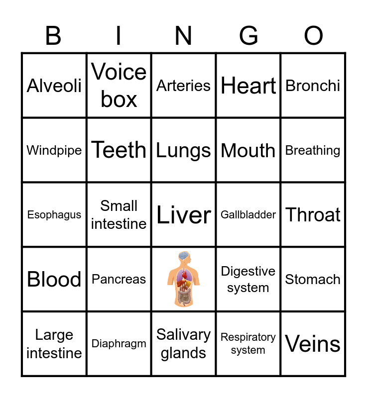 This bingo card has 1 images, a free space and 25 words: Respiratory system, Lungs, Diaphragm, Bronchi, Alveoli, Windpipe, Voice box, Throat, Digestive system, Mouth, Esophagus, Stomach, Large intestine, Small intestine, Circulatory system, Heart, Blood, Arteries, Veins, Breathing, Salivary glands, Gallbladder, Pancreas, Teeth and Tongue.