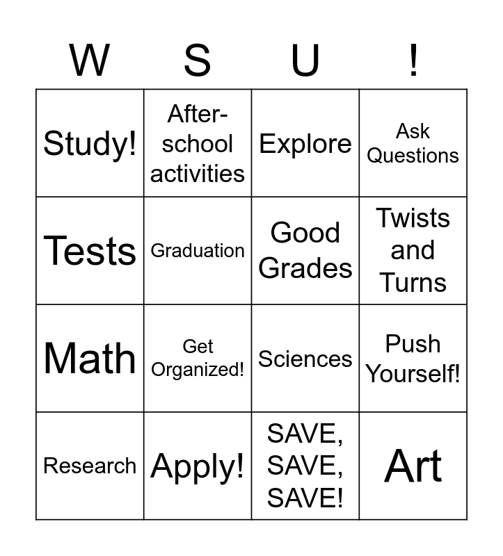 This bingo card has 25 words: Free!, Prepare!, Twists and Turns, Scholarships, Tests, Study!, Graduation, After-school activities, Apply!, FAFSA, Math, Sciences, English, Financial Aid, Good Grades, MENTOR, SAVE, SAVE, SAVE!, Explore, Get Organized!, Push Yourself!, Research, Recommendation, Art, Ask Questions and GPA.