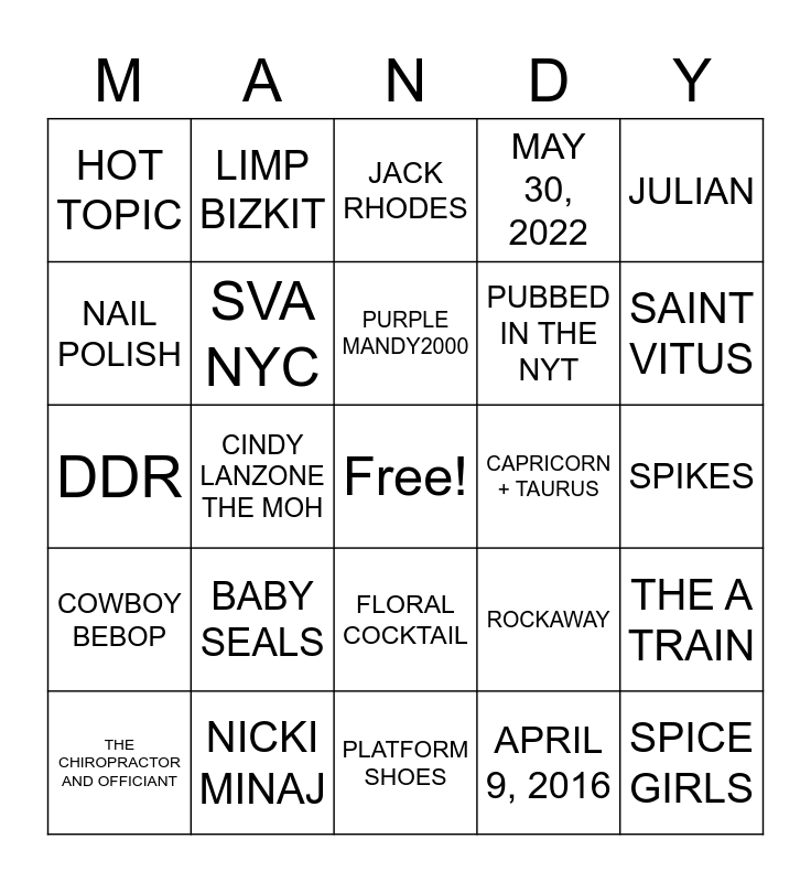 This bingo card has a free space and 24 words: BABY SEALS, NICKI MINAJ, PURPLE MANDY2000, THE CHIROPRACTOR AND OFFICIANT, JULIAN, HOT TOPIC, NAIL POLISH, LIMP BIZKIT, CAPRICORN + TAURUS, FLORAL COCKTAIL, PUBBED IN THE NYT, DDR, ROCKAWAY, THE A TRAIN, SVA NYC, APRIL 9, 2016, SPIKES, JACK RHODES, SAINT VITUS, CINDY LANZONE THE MOH, SPICE GIRLS, COWBOY BEBOP, MAY 30, 2022 and PLATFORM SHOES.