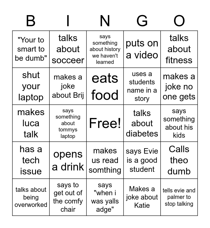 This bingo card has a free space and 24 words: opens a drink, says to get out of the comfy chair, eats food, talks about being overworked, talks about fitness, "Your to smart to be dumb", shut your laptop, talks about socceer, talks about diabetes, makes us read somthing, uses a students name in a story, makes luca talk, says Evie is a good student, Calls theo dumb, makes a joke about Brij, Makes a joke about Katie, says something about his kids, says something about history we haven't learned, makes a joke no one gets, says something about tommys laptop, tells evie and palmer to stop talking, has a tech issue, puts on a video and says "when i was yalls adge".