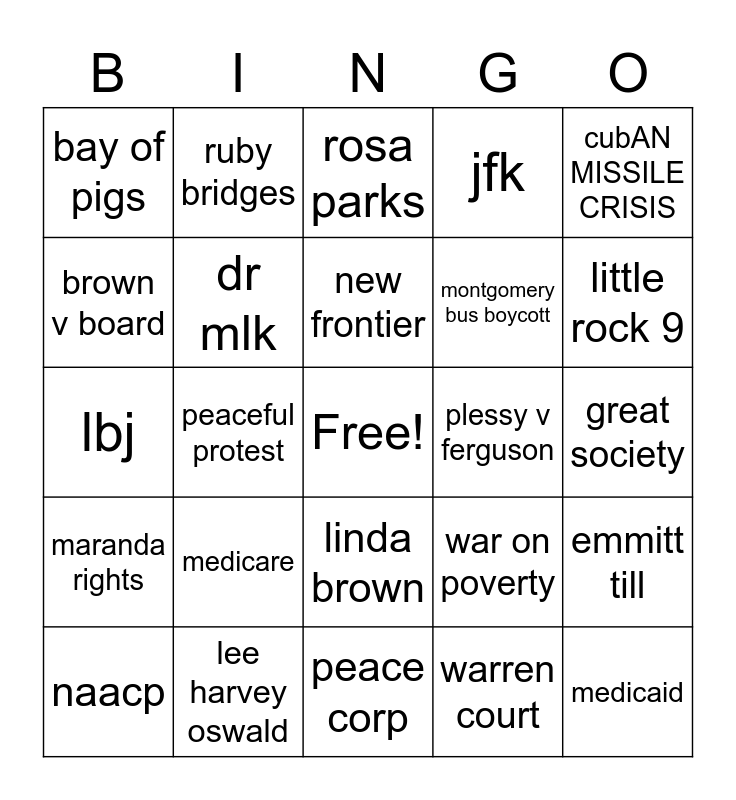 This bingo card has a free space and 24 words: medicare, lee harvey oswald, new frontier, naacp, cubAN MISSILE CRISIS, bay of pigs, brown v board, ruby bridges, plessy v ferguson, linda brown, montgomery bus boycott, lbj, war on poverty, emmitt till, dr mlk, warren court, great society, rosa parks, little rock 9, peaceful protest, medicaid, maranda rights, jfk and peace corp.