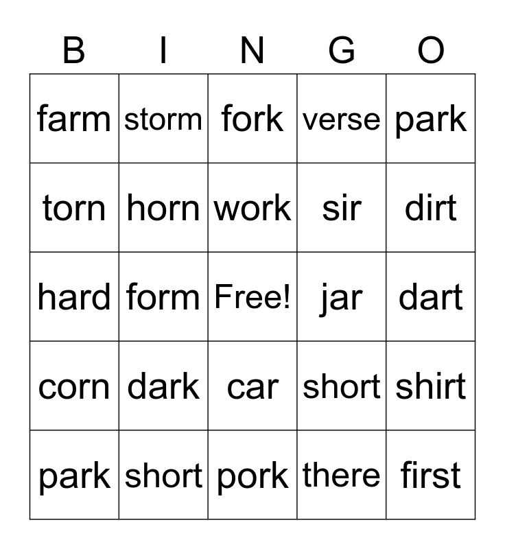 This bingo card has a free space and 29 words: park, bird, form, barn, farm, fork, horn, dark, jar, short, dart, first, pork, there, dirt, star, car, corn, park, hard, short, art, sir, torn, verse, storm, shirt, work and urge.