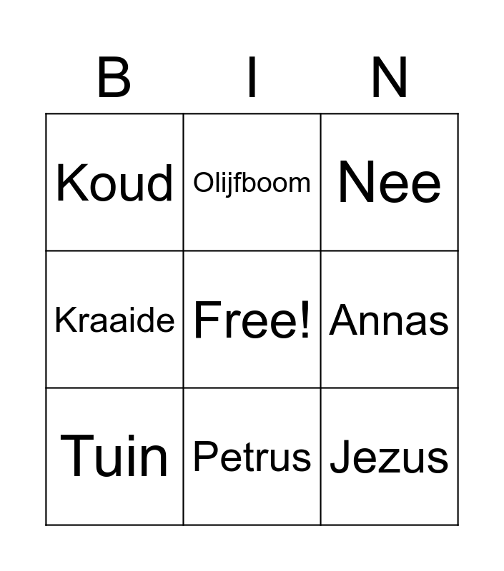 This bingo card has a free space and 23 words: Vuur, Haan, Petrus, Bang, Jezus, Koud, Annas, Olijfboom, Klap, Vrienden, Meester, Duwen, God, Tempel, Pasen, Vragen, Nee, Paleis, Tuin, Drie, Kraaide, Johannes and Priester.