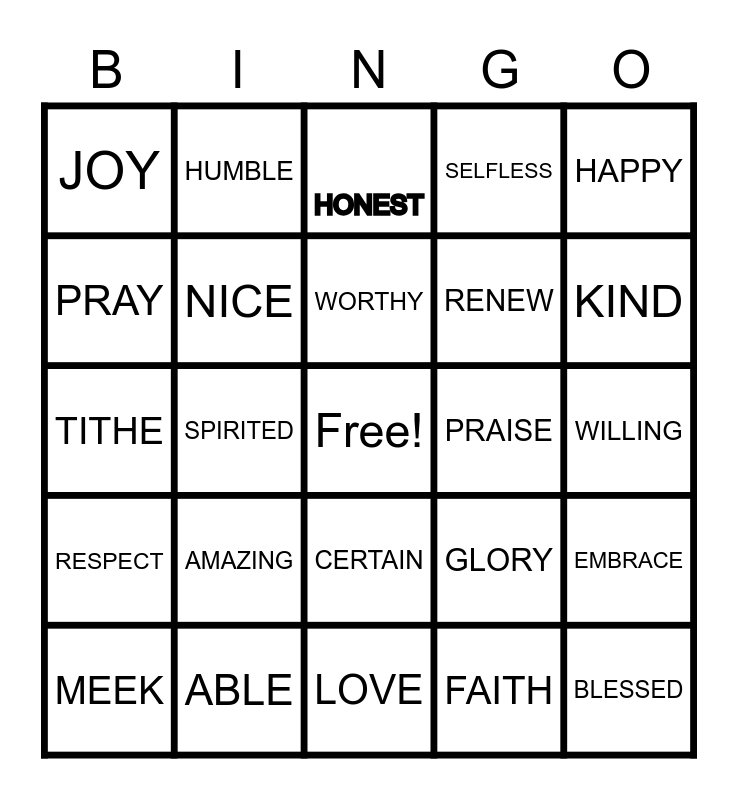 This bingo card has a free space and 24 words: MEEK, AMAZING, WORTHY, FAITH, HAPPY, JOY, HUMBLE, HONEST, PRAISE, WILLING, TITHE, NICE, GLORY, EMBRACE, PRAY, ABLE, LOVE, SELFLESS, KIND, RESPECT, SPIRITED, CERTAIN, RENEW and BLESSED.
