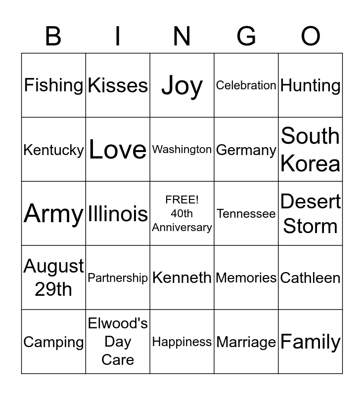 This bingo card has a free space and 24 words: Partnership, Elwood's Day Care, Washington, Camping, Hunting, Fishing, Kentucky, Kisses, Tennessee, Kenneth, Germany, Army, Memories, Cathleen, Love, Marriage, Desert Storm, Joy, South Korea, Illinois, Family, August 29th, Celebration and Happiness.