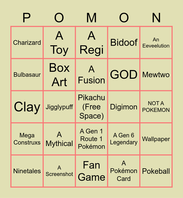 This bingo card has a free space and 24 words: A Mythical, A Screenshot, A Fusion, Ninetales, An Eeveelution, Charizard, Bulbasaur, A Toy, Digimon, A Gen 1 Route 1 Pokémon, GOD, Clay, A Gen 6 Legendary, Wallpaper, Box Art, A Pokémon Card, NOT A POKEMON, A Regi, Mewtwo, Jigglypuff, Pokeball, Mega Construxs, Bidoof and Fan Game.