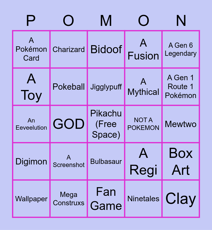 This bingo card has a free space and 24 words: A Screenshot, Mega Construxs, Jigglypuff, Wallpaper, A Gen 6 Legendary, A Pokémon Card, A Toy, Charizard, NOT A POKEMON, Bulbasaur, A Mythical, An Eeveelution, A Regi, Box Art, Pokeball, Ninetales, Mewtwo, Bidoof, A Gen 1 Route 1 Pokémon, GOD, Clay, Digimon, A Fusion and Fan Game.
