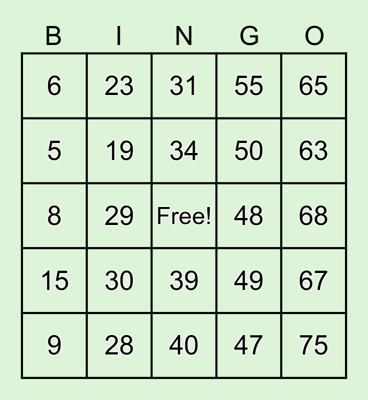 This bingo card has a free space and 75 words: 1, 16, 31, 46, 61, 2, 17, 32, 47, 62, 3, 18, 48, 63, 4, 19, 33, 49, 64, 5, 20, 34, 50, 65, 6, 21, 35, 51, 66, 7, 22, 36, 52, 67, 8, 23, 37, 53, 68, 9, 24, 38, 54, 69, 10, 25, 39, 55, 70, 11, 26, 40, 56, 71, 12, 27, 41, 57, 72, 13, 28, 42, 58, 73, 14, 29, 43, 59, 74, 15, 30, 44, 60, 75 and 45.