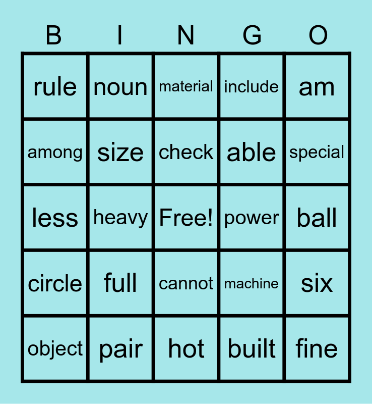 This bingo card has a free space and 25 words: full, hot, check, object, am, rule, among, noun, power, cannot, able, less, machine, six, size, dark, ball, material, special, heavy, fine, pair, circle, include and built.