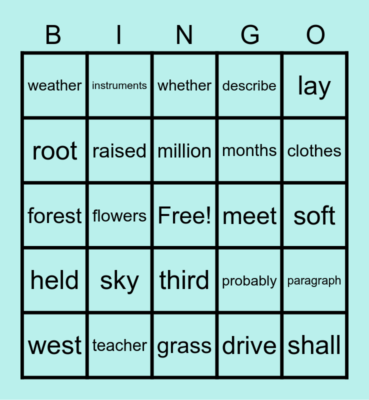 This bingo card has a free space and 25 words: sky, grass, million, west, lay, weather, root, instruments, meet, third, months, forest, probably, paragraph, raised, represent, soft, whether, clothes, flowers, shall, teacher, held, describe and drive.