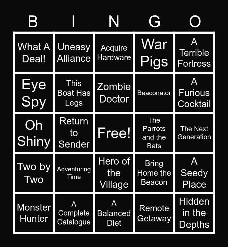 This bingo card has a free space and 75 words: Stone Age, Getting An Upgrade, Acquire Hardware, Suit Up, Hot Stuff, Isn't It Iron Pick, Not Today, Thank You, Ice Bucket Challenge, Diamonds!, We Need to Go Deeper, Cover Me With Diamonds, Enchanter, Zombie Doctor, Eye Spy, The End?, Return to Sender, Those Were the Days, Hidden in the Depths, Subspace Bubble, A Terrible Fortress, Who is Cutting Onions?, Oh Shiny, This Boat Has Legs, Uneasy Alliance, War Pigs, Country Lode, Take Me Home, Cover Me in Debris, Sppoky Scary Skeletons, Into Fire, Not Quite "Nine" Lives, Hot Tourist Destinations, Withering Heights, Local Brewery, Bring Home the Beacon, A Furious Cocktail, Beaconator, How Did We Get Here?, Free the End, The Next Generation, Remote Getaway, The End... Again..., You Need a Mint, The City at the End of the Game, Sky's the Limit, Great View From Up Here, Voluntary Exile, Monster Hunter, What A Deal!, Sticky Situation, Ol' Betsy, Sweet Dreams, Hero of the Village, A Throwaway Joke, Take Aim, Monsters Hunted, Postmortal, Hired Help, Two Birds, One Arrow, Who's the Pillager Now, Arbalistic, Adventuring Time, Very Very Frightening, Sniper Duel, Bullseye, Bee Our Guest, The Parrots and the Bats, Best Friends Forever, Fishy Business, Total Beelocation, A Seedy Place, Two by Two, A Complete Catalogue, Tactical Fishing, A Balanced Diet and Serious Dedication.