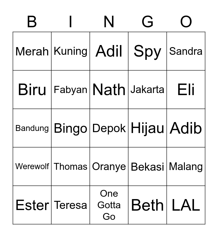 This bingo card has a free space and 24 words: Thomas, Teresa, Nath, Ester, Sandra, Merah, Biru, Kuning, Hijau, Oranye, Jakarta, Bandung, Bekasi, Malang, Fabyan, Beth, Adib, Adil, Eli, Bingo, LAL, Werewolf, Spy and One Gotta Go.