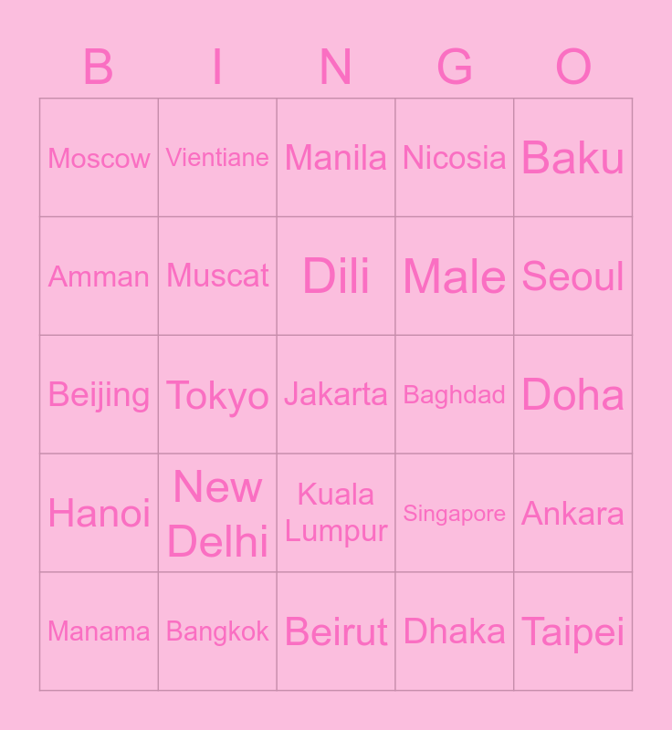 This bingo card has a free space and 24 words: New Delhi, Bangkok, Dili, Manama, Baku, Moscow, Amman, Vientiane, Baghdad, Kuala Lumpur, Male, Beijing, Singapore, Ankara, Muscat, Dhaka, Doha, Manila, Seoul, Tokyo, Taipei, Hanoi, Nicosia and Beirut.