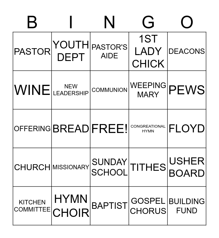 This bingo card has a free space and 24 words: MISSIONARY, HYMN CHOIR, COMMUNION, KITCHEN COMMITTEE, DEACONS, PASTOR, WINE, YOUTH DEPT, CONGREATIONAL HYMN, SUNDAY SCHOOL, WEEPING MARY, OFFERING, TITHES, USHER BOARD, NEW LEADERSHIP, GOSPEL CHORUS, FLOYD, PASTOR'S AIDE, PEWS, BREAD, BUILDING FUND, CHURCH, 1ST LADY CHICK and BAPTIST.