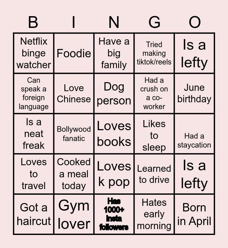 This bingo card has a free space and 24 words: Cooked a meal today, Gym lover, Dog person, Got a haircut, Is a lefty, Netflix binge watcher, Can speak a foreign language, Foodie, Likes to sleep, Loves k pop, Had a crush on a co-worker, Is a neat freak, Learned to drive, Is a lefty, Love Chinese, Hates early morning, Had a staycation, Have a big family, June birthday, Bollywood fanatic, Born in April, Loves to travel, Tried making tiktok/reels and Has 1000+ insta followers.