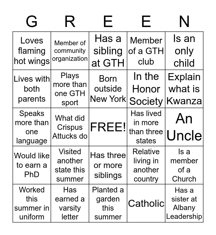 This bingo card has a free space and 24 words: Visited another state this summer, Has earned a varsity letter, Born outside New York, Worked this summer in uniform, Is an only child, Loves flaming hot wings, Lives with both parents, Member of community organization, Has lived in more than three states, Has three or more siblings, In the Honor Society, Speaks more than one language, Relative living in another country, Is a member of a Church, Plays more than one GTH sport, Catholic, An Uncle, Has a sibling at GTH, Explain what is Kwanza, What did Crispus Attucks do, Has a sister at Albany Leadership, Would like to earn a PhD, Member of a GTH club and Planted a garden this summer.