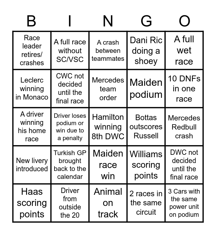 This bingo card has a free space and 24 words: Turkish GP brought back to the calendar, Driver from outside the 20, Mercedes team order, Haas scoring points, A full wet race, Race leader retires/ crashes, Leclerc winning in Monaco, A full race without SC/VSC, Bottas outscores Russell, Maiden race win, Maiden podium, A driver winning his home race, Williams scoring points, DWC not decided until the final race, CWC not decided until the final race, 2 races in the same circuit, Mercedes Redbull crash, A crash between teammates, 10 DNFs in one race, Driver loses podium or win due to a penalty, 3 Cars with the same power unit on podium, New livery introduced, Dani Ric doing a shoey and Animal on track.