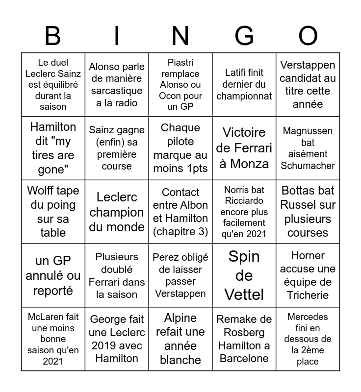 This bingo card has a free space and 24 words: Plusieurs doublé Ferrari dans la saison, George fait une Leclerc 2019 avec Hamilton, Chaque pilote marque au moins 1pts, McLaren fait une moins bonne saison qu'en 2021, Verstappen candidat au titre cette année, Le duel Leclerc Sainz est équilibré durant la saison, Hamilton dit "my tires are gone", Alonso parle de manière sarcastique a la radio, Norris bat Ricciardo encore plus facilement qu'en 2021, Perez obligé de laisser passer Verstappen, Victoire de Ferrari à Monza, Wolff tape du poing sur sa table, Spin de Vettel, Horner accuse une équipe de Tricherie, Sainz gagne (enfin) sa première course, Remake de Rosberg Hamilton a Barcelone, Bottas bat Russel sur plusieurs courses, Piastri remplace Alonso ou Ocon pour un GP, Magnussen bat aisément Schumacher, Leclerc champion du monde, Mercedes fini en dessous de la 2ème place, un GP annulé ou reporté, Latifi finit dernier du championnat and Alpine refait une année blanche.