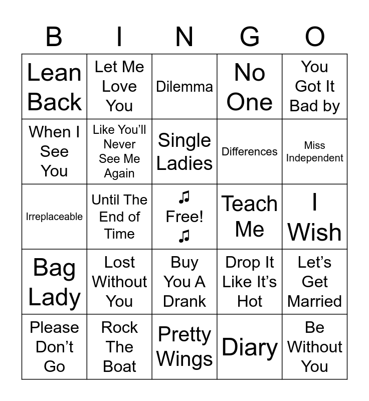 This bingo card has a free space and 50 words: Billboard Top R&B & Hip Hop Songs of the Decade (2000 to 2009), Be Without You, We Belong Together, Pretty Wings, Lost Without You, Blame It, Let Me Love You, Heaven Sent, When I See You, If I Ain’t Got You, Like You’ll Never See Me Again, No One, Let’s Get Married, Drop It Like It’s Hot, I Remember, Foolish, Single Ladies, Teach Me, Yeah, You Got It Bad by, Until The End of Time, Diary, Lean Back, Differences, Just Fine, Incomplete, Miss Independent, I Wanna Know, Dilemma, Buy You A Drank, In Da Club, Need You Bad, Spotlight, Always On Time, Rock The Boat, Hot Boyz, It’s Goin Down, Get Low, You Don’t Know My Name, I Wish, Love Of My Life, Work It, Best I Ever Had, Whatever You Like, Please Don’t Go, Irreplaceable, You, Family Affair, Bag Lady and Unpredictable.