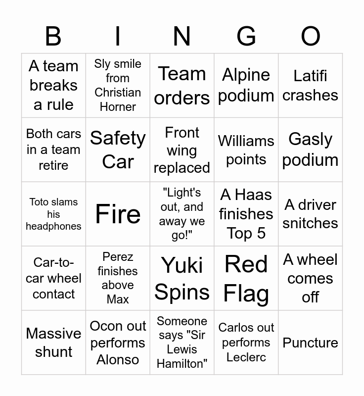 This bingo card has a free space and 34 words: McLaren in the points, Carlos out performs Leclerc, Alonso gets angry, Lewis says "my tires are gone", Car-to-car wheel contact, Safety Car, Latifi crashes, Massive shunt, Sly smile from Christian Horner, Bottas finishes Top 7, Front wing replaced, Team orders, Pit Stop greater than 4 secs, Lewis thanks everyone at the factory, A Haas finishes Top 5, Gasly podium, Ocon out performs Alonso, Toto slams his headphones, Perez finishes above Max, Red Flag, Yuki Spins, Teammate collision, A team breaks a rule, A driver snitches, Someone says "Sir Lewis Hamilton", Puncture, Alpine podium, Max says "What is he doing?!", Williams points, Both cars in a team retire, Two teammates on a podium, Fire, A wheel comes off and Spot a British Flag in the crowd.