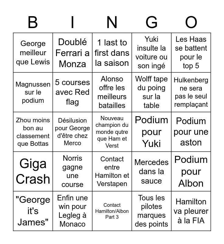 This bingo card has a free space and 24 words: Norris gagne une course, Enfin une win pour Legleg à Monaco, Alonso offre les meilleurs batailles, "George it's James", Les Haas se battent pour le top 5, George meilleur que Lewis, Magnussen sur le podium, Doublé Ferrari a Monza, Podium pour Yuki, Contact entre Hamilton et Verstapen, Wolff tape du poing sur la table, Zhou moins bon au classement que Bottas, Mercedes dans la sauce, Podium pour Albon, 5 courses avec Red flag, Tous les pilotes marques des points, Podium pour une aston, 1 last to first dans la saison, Hulkenberg ne sera pas le seul remplaçant, Désilusion pour George d'être chez Merco, Hamilton va pleurer à la FIA, Giga Crash, Yuki insulte la voiture ou son ingé and Contact Hamilton/Albon Part 3.