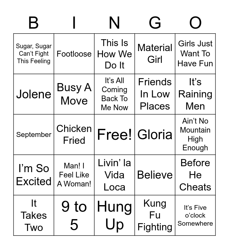 This bingo card has a free space and 69 words: Sweet Caroline, Ain’t No Mountain High Enough, Dancing Queen, Life is a Highway, 9 to 5, I Wanna Dance with Somebody ( who loves me), Material Girl, Billie Jean, Girls Just Want To Have Fun, Respect, Before He Cheats, Lean on Me, Sugar, Sugar Can’t Fight This Feeling, This Is How We Do It, Sweet Dreams ( Are made of this ), Chicken Fried, Livin’ la Vida Loca, Friends In Low Places, Love Shack, I’m So Excited, Gloria, Believe, It’s Raining Men, Walking on Sunshine, (I’ve Had) The Time of My Life, Celebration, Mama Mia, Build me up Buttercup, Kung Fu Fighting, Since you Been Gone, Footloose, La Bamba, Don’t Worry Be Happy, Everybody Needs Somebody to Love, Superstition, My Girl, I’m Like A Bird, Lady Marmalade, Jolene, Don’t You Want Me, Man! I Feel Like A Woman!, It’s Five o’clock Somewhere, In the Summertime, Na Na Hey Hey ( Kiss Him Goodbye), Copa Cabana, It Takes Two, Don’t You ( Forget About Me), U Cant Touch This, … Baby one More Time, Busy A Move, It’s All Coming Back To Me Now, Maniac, What Is Love, Hung Up, I Got You ( I Feel Good), Rockin’ Robin, I want Candy, You Make My Dreams Come True, I’m on My Way Funky Town, September, Oh, Pretty Woman, It’s Not Unusual, Hot Stuff, P.Y.T ( Pretty Young Thing), Uptown Girl, Ring of Fire, I’m Still Standing, Pocketful Of Sunshine and Escape ( The piña Colada Song ).