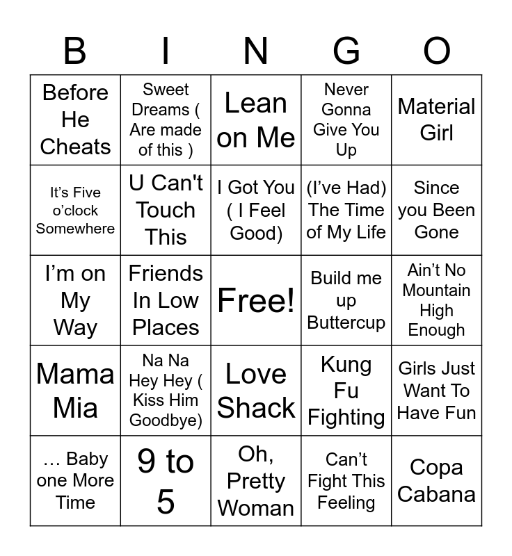 This bingo card has a free space and 70 words: Sweet Caroline, Ain’t No Mountain High Enough, Dancing Queen, Life is a Highway, 9 to 5, I Wanna Dance with Somebody ( who loves me), Never Gonna Give You Up, Kiss, Material Girl, Billie Jean, Girls Just Want To Have Fun, Respect, Before He Cheats, Lean on Me, Sugar, Sugar, Friends In Low Places, Love Shack, (I’ve Had) The Time of My Life, Celebration, Mama Mia, Build me up Buttercup, Kung Fu Fighting, Since you Been Gone, Footloose, La Bamba, Don’t Worry Be Happy, Everybody Needs Somebody to Love, Superstition, Can’t Fight This Feeling, This Is How We Do It, Sweet Dreams ( Are made of this ), Chicken Fried, Livin’ la Vida Loca, My Girl, I’m Like A Bird, Lady Marmalade, Jolene, Don’t You Want Me, Man! I Feel Like A Woman!, It’s Five o’clock Somewhere, In the Summertime, Na Na Hey Hey ( Kiss Him Goodbye), Copa Cabana, It Takes Two, Don’t You ( Forget About Me), U Can't Touch This, … Baby one More Time, Bust A Move, It’s All Coming Back To Me Now, Maniac, What Is Love, Hung Up, Funky Town, September, Oh, Pretty Woman, It’s Not Unusual, I Got You ( I Feel Good), Rockin’ Robin, I want Candy, You Make My Dreams Come True, I’m on My Way, Hot Stuff, P.Y.T ( Pretty Young Thing), Uptown Girl, Ring of Fire, I’m Still Standing, Pocketful Of Sunshine, Escape ( The piña Colada Song ), Achy Breaky Heart and Valerie (Feat. Amy Whinehouse).