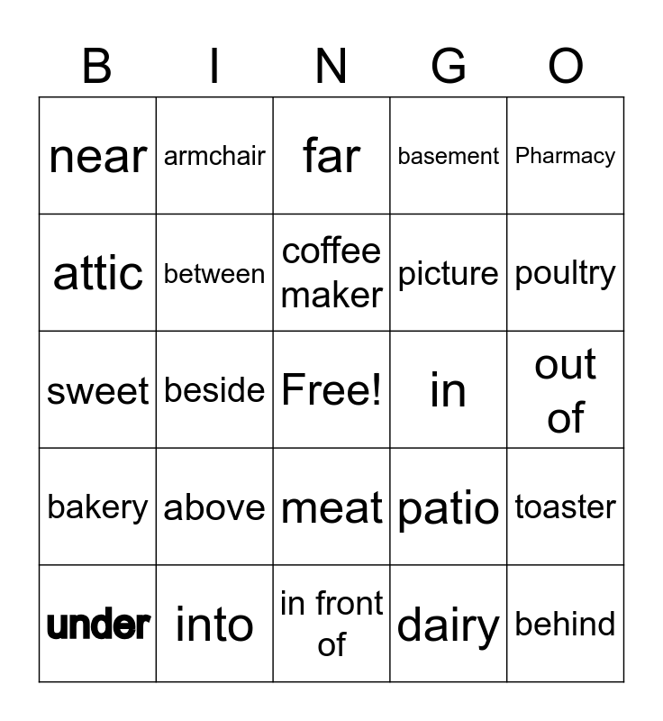 This bingo card has a free space and 29 words: under, over, beside, on, near, far, between, above, in, into, out of, behind, in front of, dairy, poultry, produce, meat, bakery, Pharmacy, sweet, patio, garden, picture, attic, basement, armchair, toaster, coffee maker and BBQ.