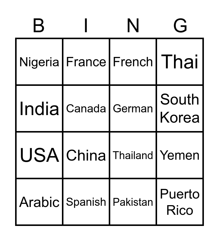 This bingo card has 28 words: Free!, English, USA, England, Canada, French, France, Puerto Rico, Spanish, Spain, Thailand, Thai, Mandarin, Germany, China, Japanese, Japan, German, South Korea, Korean, Nigeria, Igbo, Arabic, Yemen, Pakistan, Urdu, India and Punjabi.