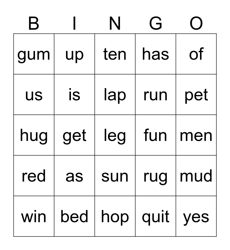 This bingo card has 25 words: as, hop, lap, win, of, gum, us, up, fun, sun, run, hug, rug, mud, is, yes, men, ten, pet, get, leg, bed, red, has and quit.
