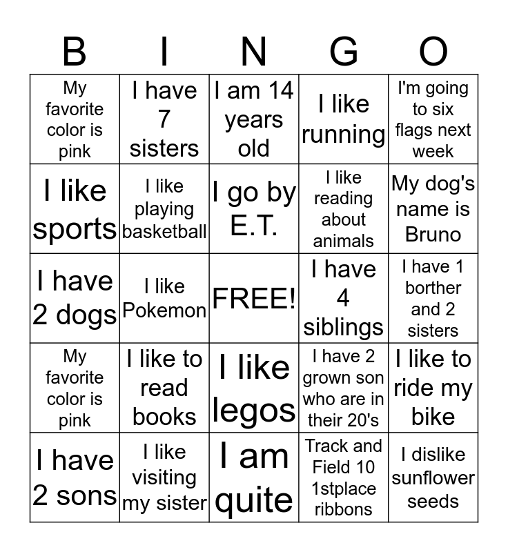 This bingo card has a free space and 24 words: I like to read books, I like visiting my sister, I go by E.T., I have 2 sons, I'm going to six flags next week, My favorite color is pink, I like sports, I have 7 sisters, I have 4 siblings, I like legos, I like reading about animals, I have 2 dogs, I have 2 grown son who are in their 20's, I like to ride my bike, I like playing basketball, Track and Field 10 1stplace ribbons, I have 1 borther and 2 sisters, I am 14 years old, My dog's name is Bruno, I like Pokemon, I dislike sunflower seeds, My favorite color is pink, I like running and I am quite.