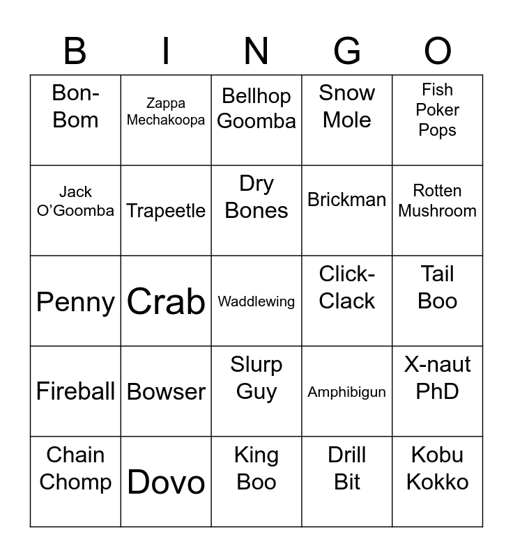 This bingo card has 25 words: Bowser, King Boo, Dry Bones, Chain Chomp, Fish Poker Pops, Bon-Bom, Jack O’Goomba, Zappa Mechakoopa, Click-Clack, Slurp Guy, Brickman, Penny, Amphibigun, X-naut PhD, Trapeetle, Kobu Kokko, Tail Boo, Bellhop Goomba, Rotten Mushroom, Crab, Waddlewing, Dovo, Fireball, Snow Mole and Drill Bit.