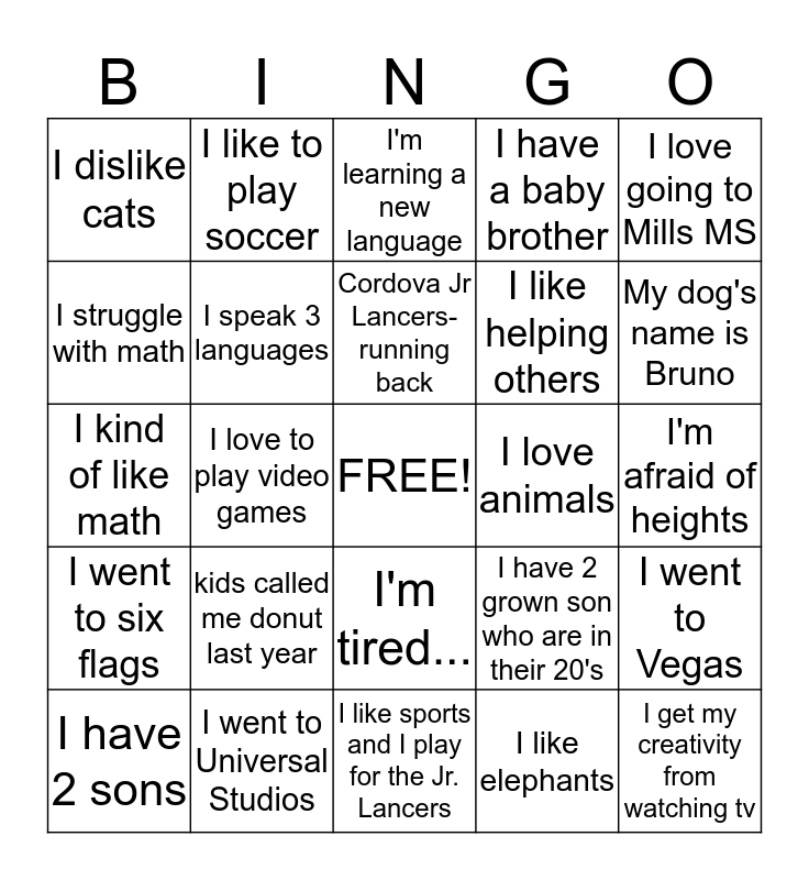 This bingo card has a free space and 24 words: kids called me donut last year, I went to Universal Studios, Cordova Jr Lancers-running back, I have 2 sons, I love going to Mills MS, I dislike cats, I struggle with math, I like to play soccer, I love animals, I'm tired..., I like helping others, I kind of like math, I have 2 grown son who are in their 20's, I went to Vegas, I speak 3 languages, I like elephants, I'm afraid of heights, I'm learning a new language, My dog's name is Bruno, I love to play video games, I get my creativity from watching tv, I went to six flags, I have a baby brother and I like sports and I play for the Jr. Lancers.