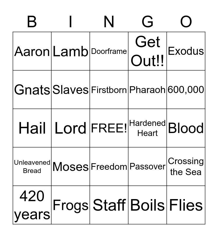 This bingo card has a free space and 24 words: Moses, Frogs, Firstborn, 420 years, Exodus, Aaron, Gnats, Lamb, Hardened Heart, Freedom, Pharaoh, Hail, Passover, Crossing the Sea, Slaves, Boils, Blood, Doorframe, 600,000, Lord, Flies, Unleavened Bread, Get Out!! and Staff.