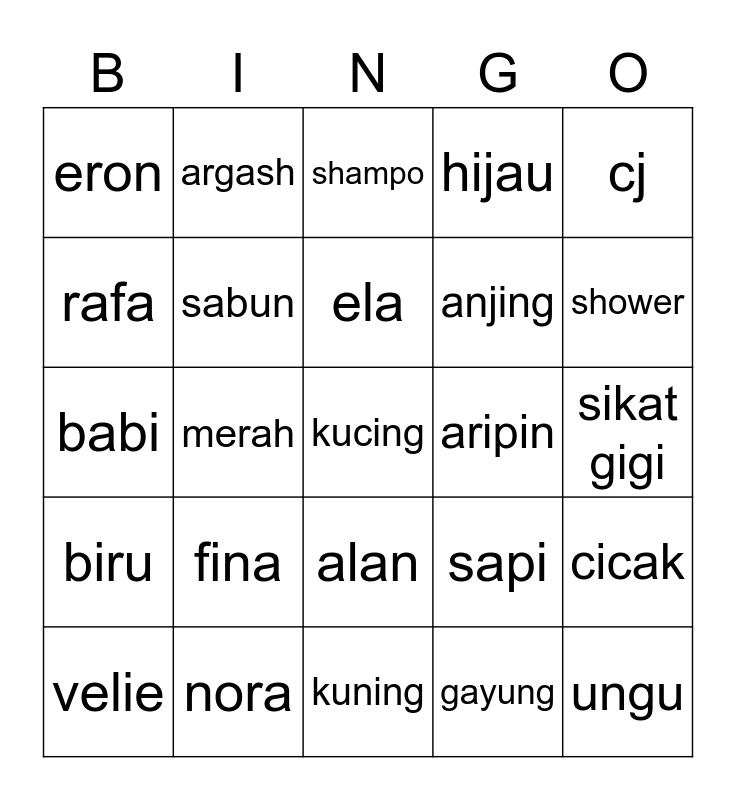 This bingo card has a free space and 24 words: fina, nora, ela, velie, cj, eron, rafa, argash, aripin, alan, anjing, babi, sapi, cicak, sabun, gayung, sikat gigi, shampo, shower, merah, ungu, biru, hijau and kuning.