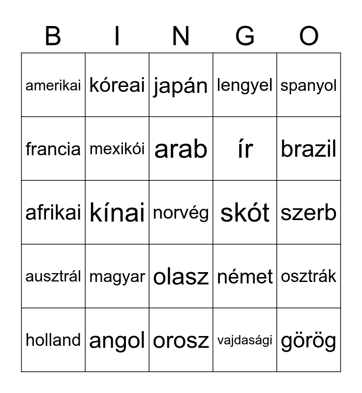 This bingo card has a free space and 24 words: magyar, angol, arab, holland, spanyol, amerikai, francia, kóreai, skót, olasz, ír, afrikai, német, osztrák, mexikói, vajdasági, szerb, japán, brazil, kínai, görög, ausztrál, lengyel and orosz.