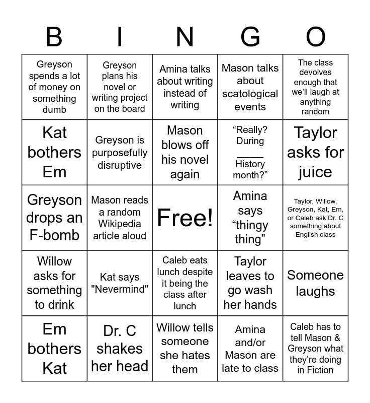 This bingo card has a free space and 84 words: Dr. C laughs silently at class antics, Kat continues to write their novel in which nothing happens, Amina talks about writing instead of writing, Caleb has a mental breakdown, Someone writes on the board, Willow and Taylor hold hands, Mason restarts all his work, Mason bullies someone via entrapment, Amina forgot to eat and has step practice today, Em asks a question that is concerning out of context, Cal doesn’t react to anything, Cal is secretly working on spanish homework, Greyson is purposefully disruptive, Amina says “thingy thing”, Race is unnecessarily involved, Greyson spends a lot of money on something dumb, Em bothers Kat, Kat bothers Em, Em pulls their hair out over something, There are sirens outside, Caleb receives criticism on the video announcements, “Really? During _____ History month?”, Caleb has to tell Mason & Greyson what they’re doing in Fiction, Someone complains about a teacher, Mason reads a random Wikipedia article aloud, Someone says, "It's ok, Dr. C. It's not your fault.", Ten full minutes of silence pass., After everyone is finally silent, Em says something off topic., After everyone is finally silent, Mason says something off topic., Greyson says something about Legos, Kat says "Nevermind", Amina says "Oh my God, You know what, never mind", Mason drops an F-bomb, Greyson drops an F-bomb, Cal roasts someone, Taylor tells someone she loves them, Willow tells someone she hates them, Willow gossips. This can be ARGS gossip or celeb gossip., Taylor asks for juice, Willow asks for something to drink, Mason asks for Diet Food Lion Ginger Ale, Someone comments on Caleb's appearance--hair or clothing., Caleb insults himself., Mason coughs or burps., Taylor accuses someone of racism or any sort of ism, Mason reads wikipedia, Greyson plans his novel or writing project on the board, Amina asks for a spoon, Someone asks Dr. C for a mask, Mason dances on the floor, Caleb falls to the floor in frustration or from laughter, Taylor leaves to go wash her hands, Mason talks about scatological events, Mason talks about comedy or irony, Greyson leaves despite it not being loud, Cal says nothing, Dr. C shakes her head, Mason blows off his novel again, Someone washes a mug, Taylor, Willow, Greyson, Kat, Em, or Caleb ask Dr. C something about English class, Mason says something that could get him expelled, Kat resorts to physically dealing with antics, Kat suggests extreme enforcement measures to deal with antics, Dr. C talks about being a bad student, Gresyon shows how dumb he is, Greyson shows how smart he is, “We texted about this!”, Dr. C looks to her side suddenly in reaction to something someone says, The class devolves enough that we’ll laugh at anything random, Kat gives up dealing with antics, Someone laughs, Amina says something nobody understands that doesn’t sound like English, Someone makes a PSA to the class, A Lit Arts teacher is talking with Dr. C as students enter 3rd block, Caleb eats lunch despite it being the class after lunch, Amina and/or Mason are late to class, Willow and Taylor don’t walk into class together, Greyson talks about about recording tech, Mason and/or Caleb talks about Print & Online, Kat talks about Pre-Calc, Em talks about Fiction II, Screenwriting and Directing is brought up, Cal, Taylor, and/or Willow talk about Government and Behind-the-scenes school logistics is discussed.